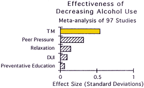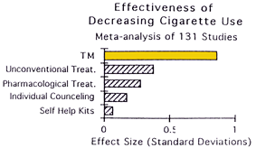 The results of eight meta-analyses on a grand total of 597 studies have found that Maharish's Transcendental Meditation technique is more effective than other meditation/relaxation techniques and programs in reducing trait anxiety, reducing blood pressure, producing deep physiological relaxation, increasing self-actualization, improving psychological outcomes, and decreasing cigarette, alcohol and drug use. (Data from Table 1, Orme-Johnson & Walton, 1998) |