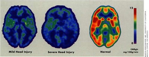 The images above are from a study where researchers examined the brain metabolism of patients who hit their heads during an accident, such as a fall. Measuring the brain's metabolic activity or the amount of sugar it uses provides clues on its function. Red indicates high brain metabolism, which is a sign of high brain activity, while blue indicates low brain metabolism or low activity. The patients, who were conscious and thought to have only mild injuries, actually had very low brain metabolism. In fact, the metabolism was as poor as some coma patients with severe head injuries. This suggests that even if a blow to the head reveals no major outside signs of trouble, there still may be some problems inside the brain.